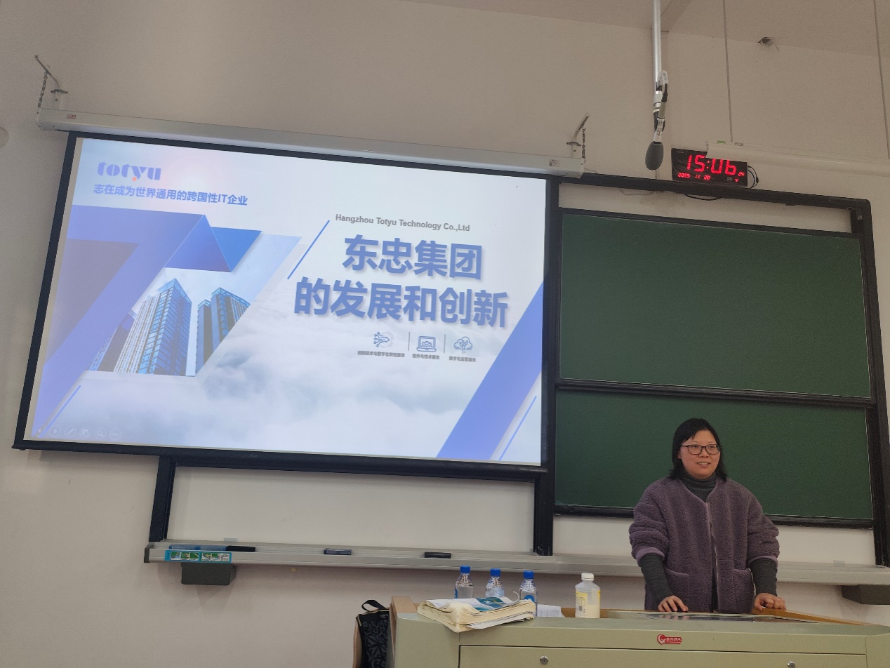 在专业知识分享之后,鲍巧玲详细介绍了东忠集团的发展历程与业务版图。作为深耕中日IT市场数十年的标杆企业,东忠集团不仅搭建起连接两国数字产业的“桥梁”,更在软件开发、系统集成、数据服务等领域积累了深厚实力。企业的行业地位与发展前景,让同学们对“日语+IT”人才的就业平台有了更直观的感受,也进一步激发了跨界学习的积极性。