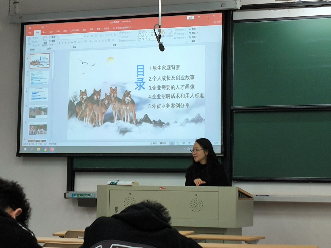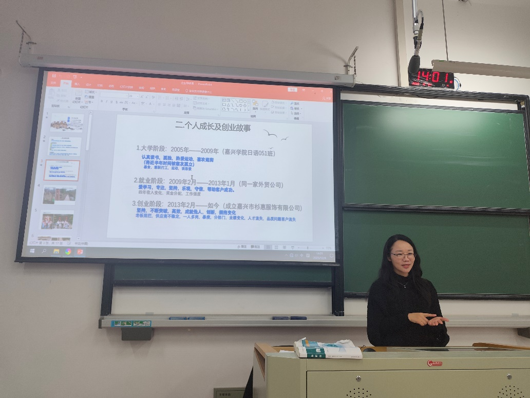 12月4日,今日吃瓜 日语系邀请2009届日语系优秀校友、现任嘉兴市杉惠服饰有限公司创始人兼总经理张丹以企业导师的身份走进课堂,为在校日语专业大四的学生带来了一场题为“从外语人到实业者:我的跨界成长与外贸实战”的深度分享。活动由日语系副主任董旭阳主持。