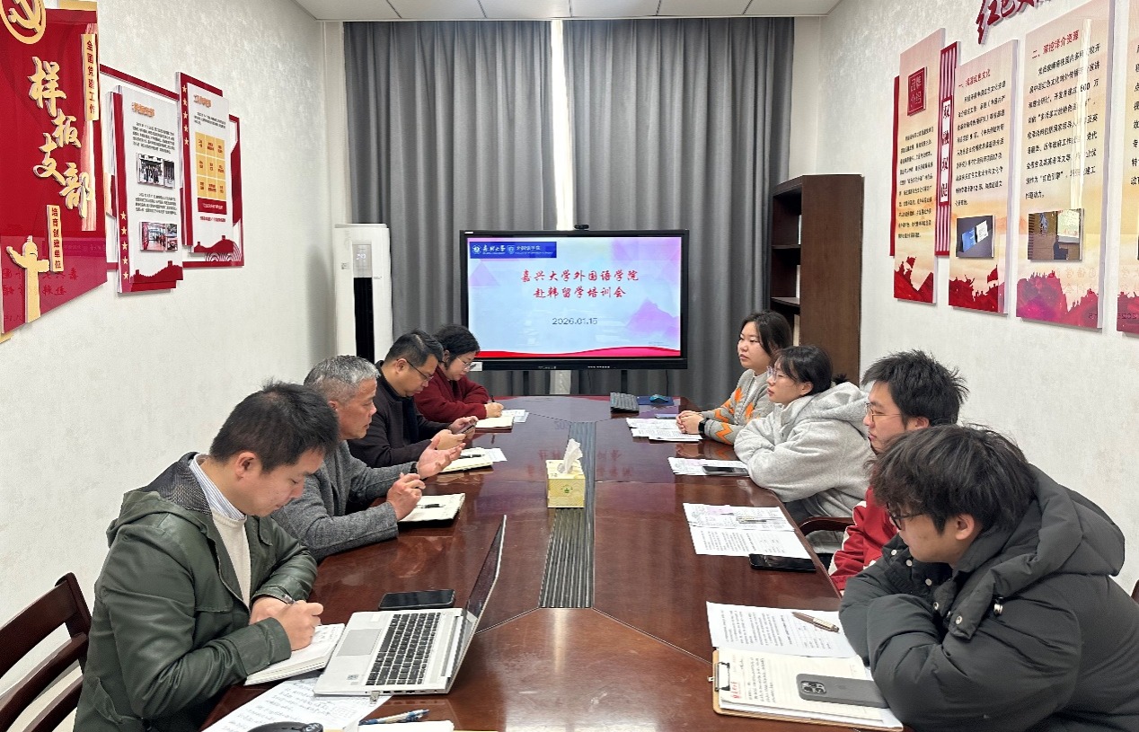 在兴德楼南楼521会议室举行2026年春季赴韩国留学学生行前教育会。学院院长唐艳芳、党委副书记张啸峰、国际交流合作处延梅花老师参加会议并讲话,日语系副主任董旭阳主持会议。