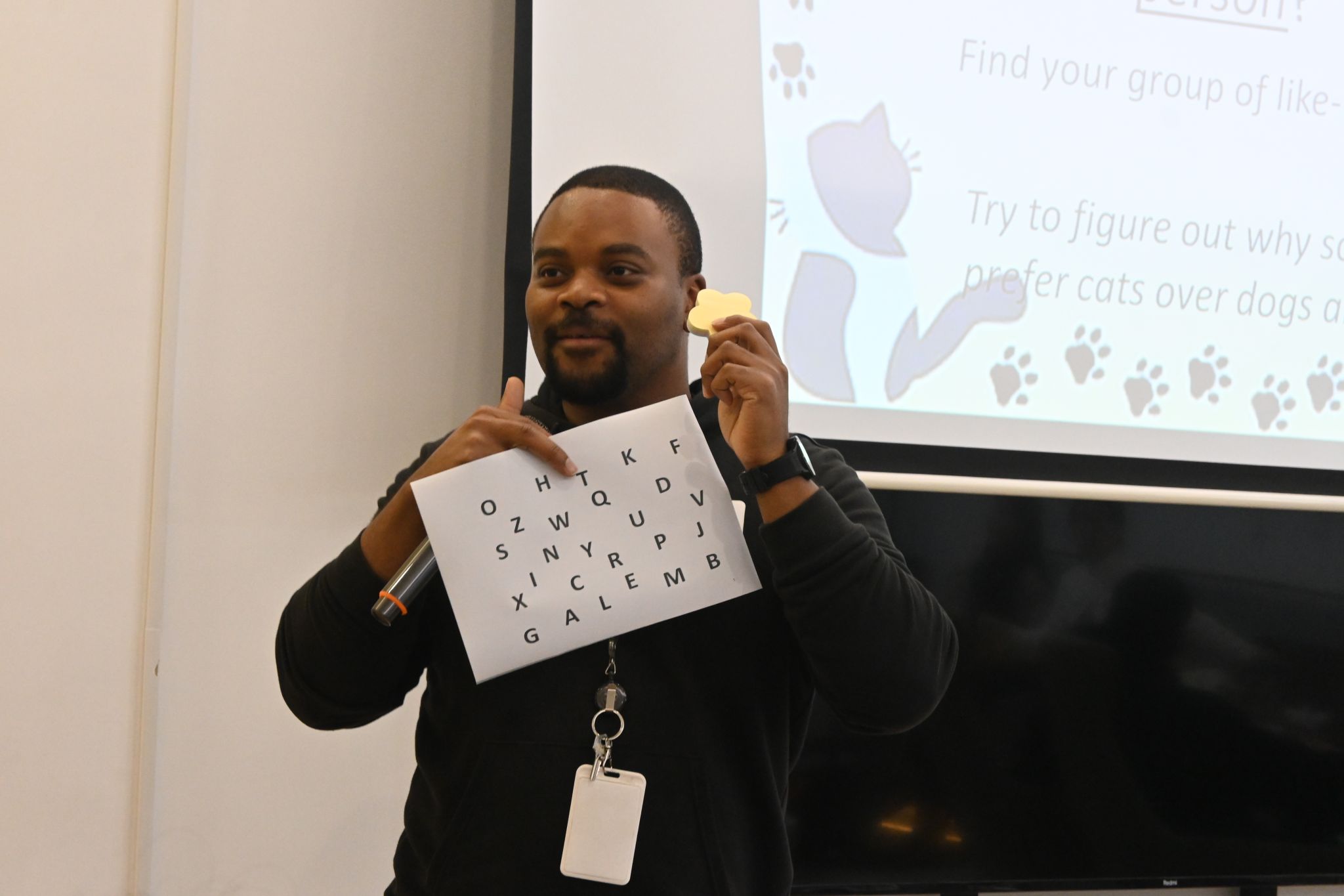 随后,活动进入字母竞猜互动环节。Kay为每组同学发放印有字母的白纸,要求大家以字母为首字母,尽可能多地列举不重复的动物种类,累计积分比拼。各小组同学迅速集结讨论,集思广益、积极作答,激烈的角逐让现场互动感拉满,既考验了同学们的外语词汇储备,也增强了团队协作能力。