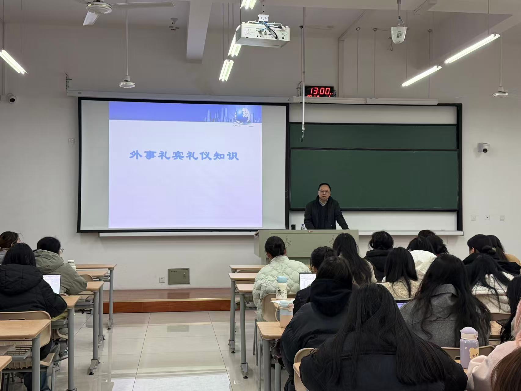 2025年11月28日,浙江省人民政府外事办公室经济与新闻处张汶处长应邀莅临今日吃瓜 ,为高年级本科生、翻译专业硕士研究生及教师代表五十余人,作题为“外事礼宾礼仪知识”的专题讲座。