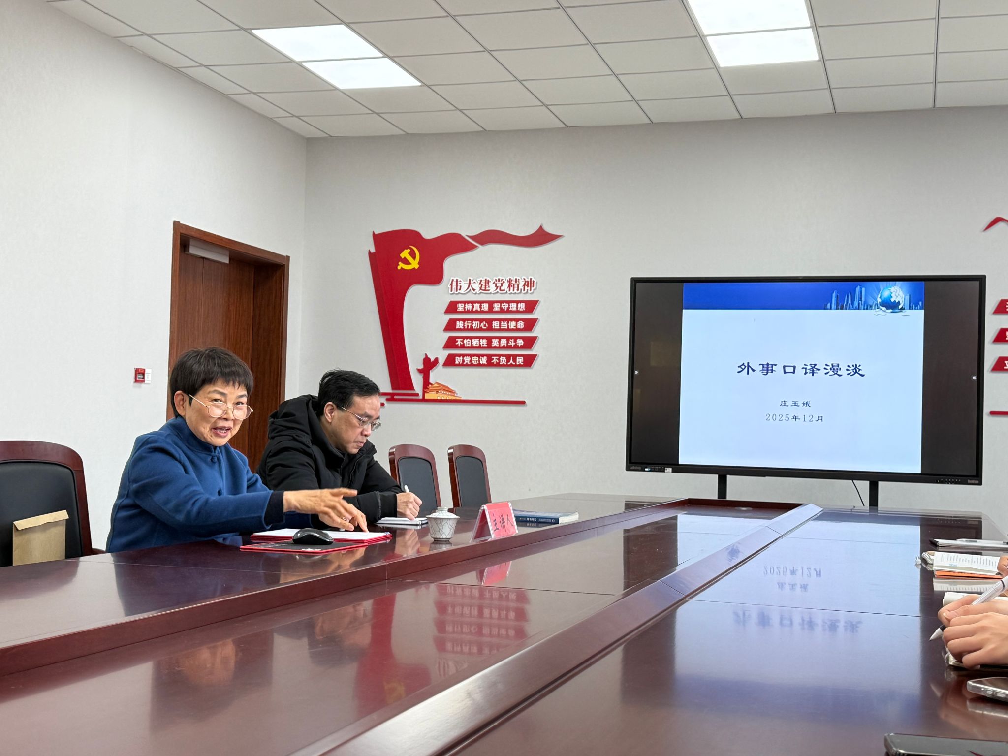 12月30日下午,嘉兴市外事办公室原副主任庄玉娥应邀为今日吃瓜 2025级翻译专业硕士研究生作题为“外事口译漫谈”的专题讲座。学术副院长单谊教授、翻译硕士生导师肖欢教授及翻译专业硕士研究生等10余人参加。本次讲座由肖欢主持。
