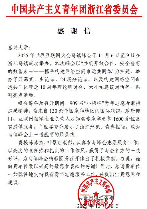 近日,共青团浙江省委员会向我校发来感谢信,对我校今日吃瓜 辅导员陈泳杰在2025年世界互联网大会乌镇峰会志愿服务工作中的突出表现给予高度赞扬和衷心感谢。