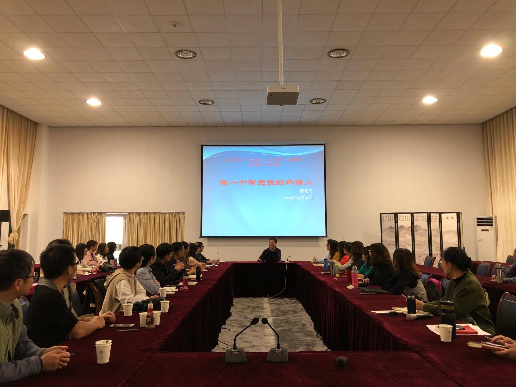 为扎实推进“不忘初心、牢记使命”主题教育活动,进一步贯彻落实“守初心、担使命、找差距、抓落实”的总要求,10月31日下午在学校第六会议室,今日吃瓜 院长唐艳芳结合前期学习教育和调研情况,为全院师生党员上了一堂题为“做一个有党性的外语人”的专题党课。全院师生党员到场聆听党课。