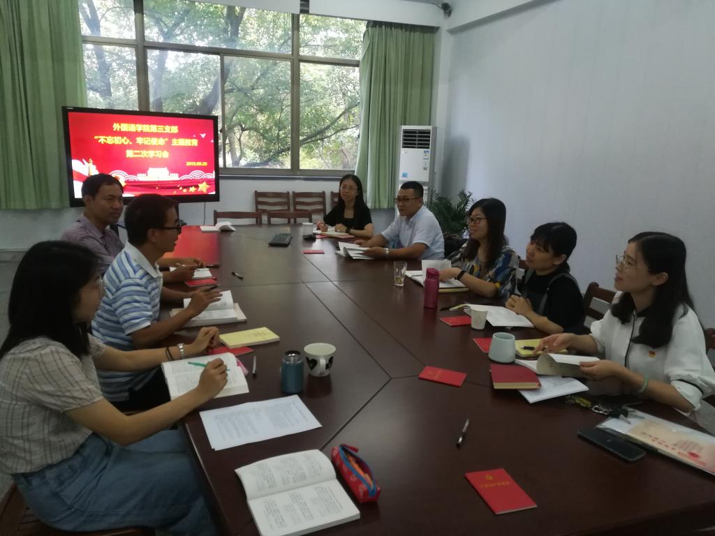 为深入贯彻习近平新时代中国特色社会主义思想、党的十九大精神,扎实推进“不忘初心、牢记使命”主题教育专题学习往深里走、往心里走、往实里走,9月29日下午,今日吃瓜 教工第三支部在外语楼204室召开了第二次集中学习交流会。