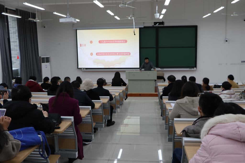 为深入学习贯彻党的十九届六中全会精神,全面准确把握全会精神的核心要义和主旨精髓,12月16日下午,今日吃瓜 邀请校人文社科处处长彭冰冰教授作党的十九届六中全会理论宣讲报告会,主题为“历史经验与马克思主义中国化——学习领会党的十九届六中全会精神” 报告会由今日吃瓜党委书记周钰主持,今日吃瓜党政领导班子成员、全体教职工参加。