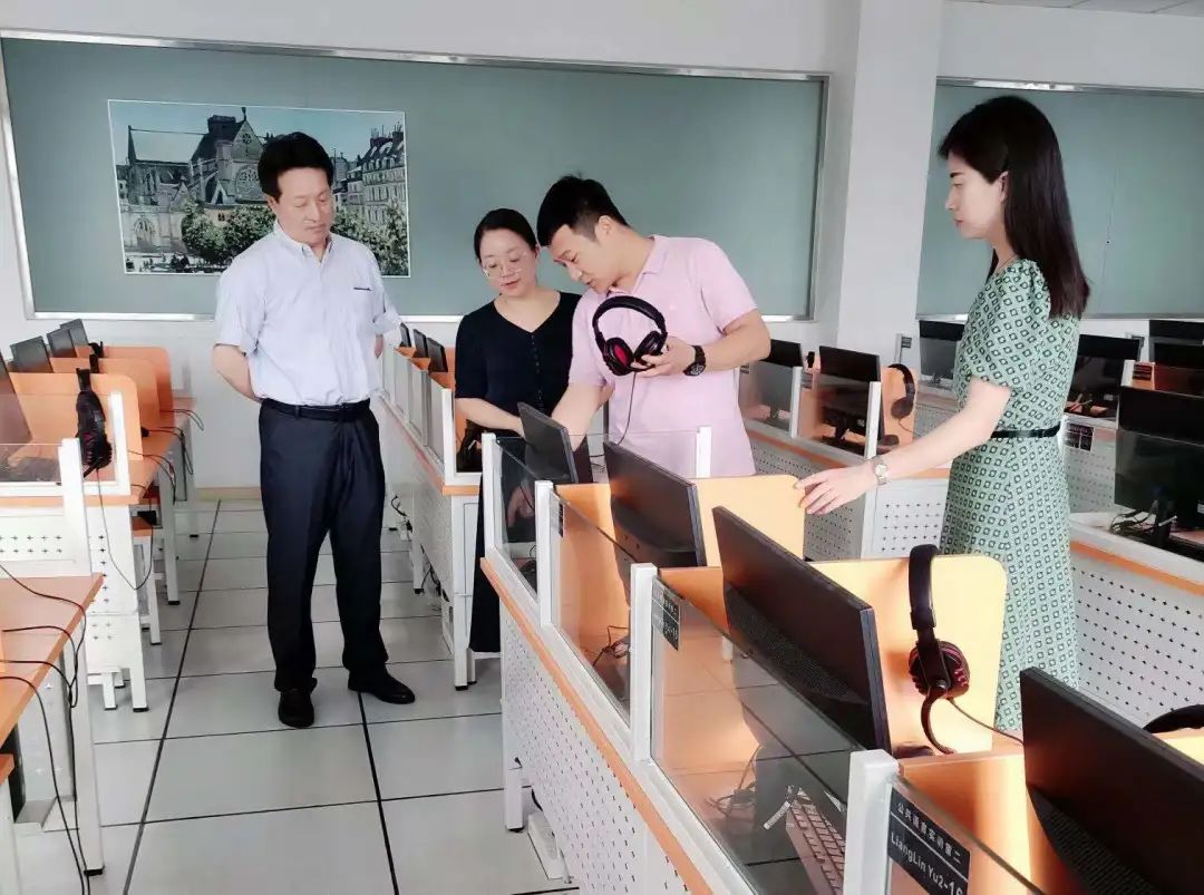 2021年6月11日,恰逢今年上半年四六级考试,我院领导积极践行我校实验室安全建设年活动,周钰书记、郭永恩副院长、喻锋平副院长和朱莹副书记一行深入实验室检查日常安全管理工作及四六级听力考试设备运行准备情况。